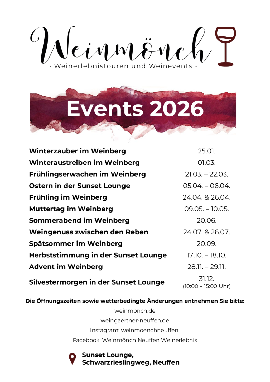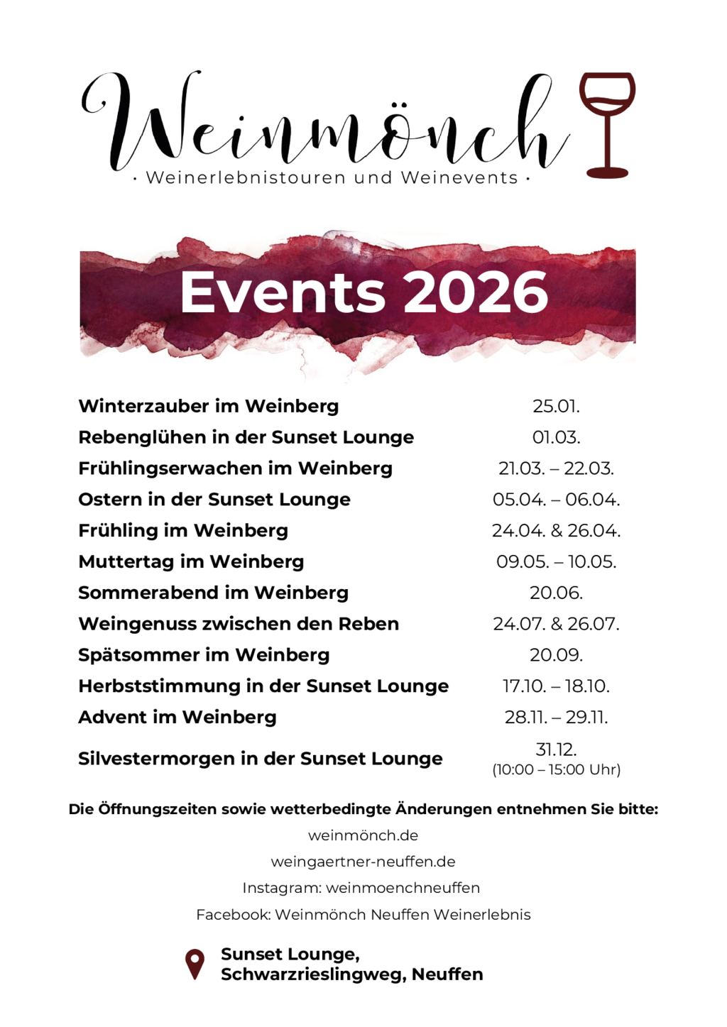 Die Termine finden Sie hier. Die Öffnungszeiten der Sunset Lounge werden erst kurzfristig festgelegt. Bei ungünstigen Wetterverhätlnissen findet das Event nicht statt. Dass die Sunset Lounge geöffnet ist, sehen Sie anhand der gehissten Fahne, bzw. den Posts auf Facebook und Instagram.